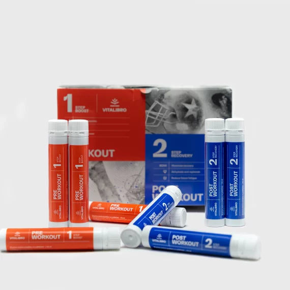 Vienoje dėžutėje “PRE-WORKOUT & POST-WORKOUT” yra 15 porcijų (porcija = 2 buteliukai: 1×PRE–WORKOUT ir 1×POST–WORKOUT ).: